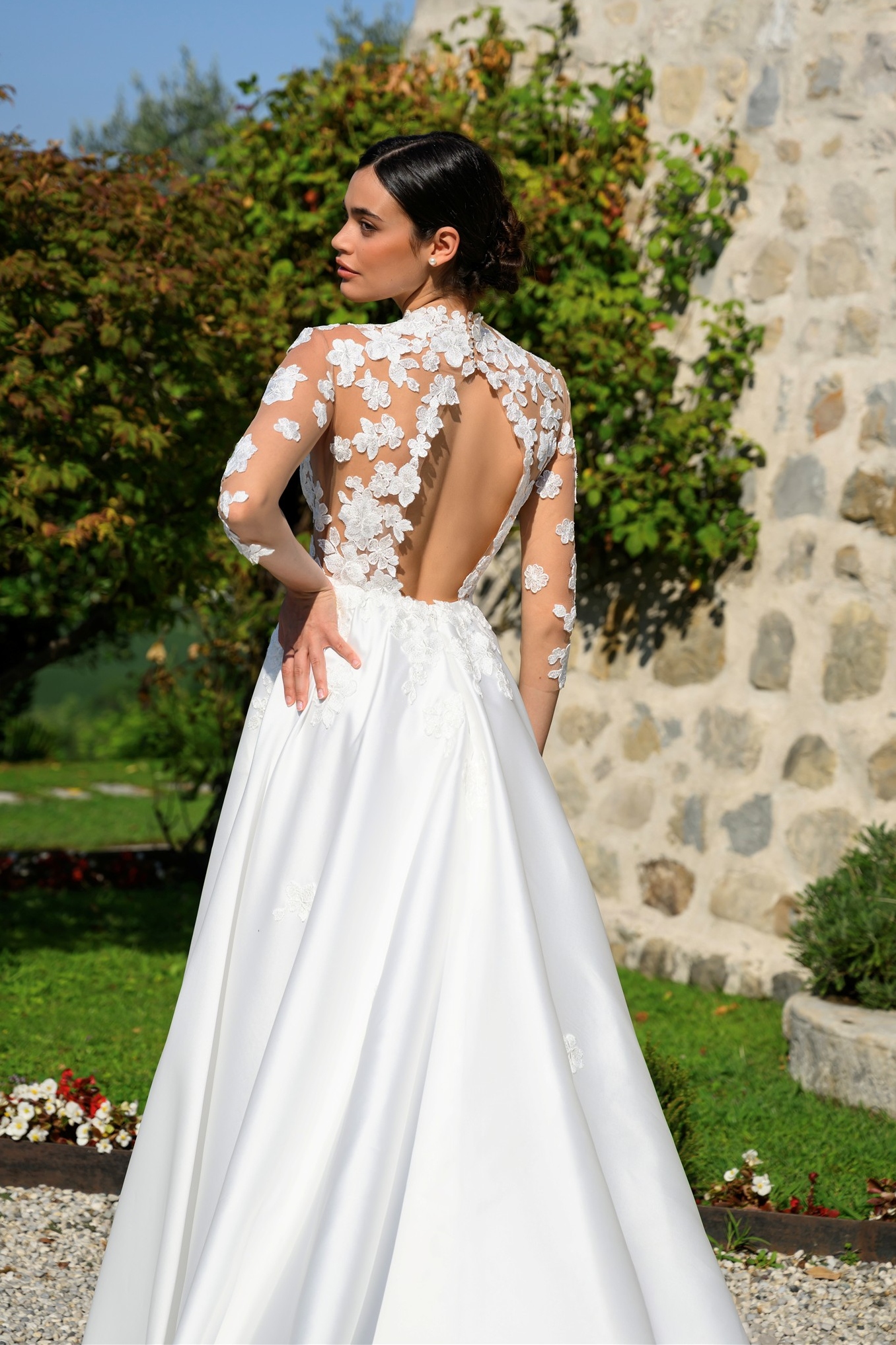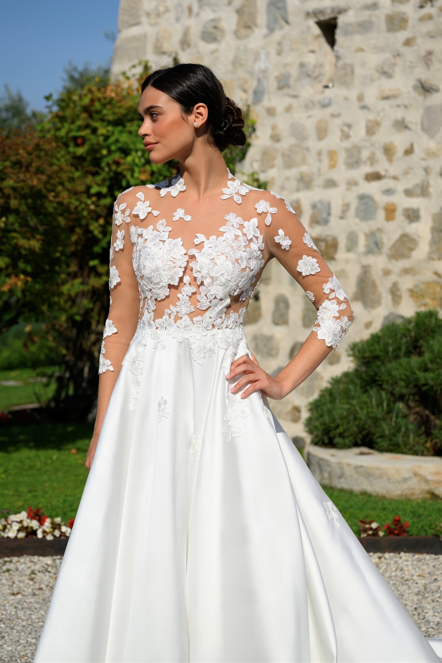 Abito da sposa ampio in mikado soft con applicazione di fiori ricamati.